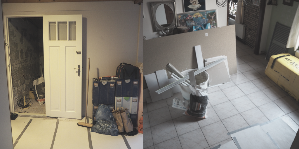 Karton op de vloeren wat omhoog krult of bobbelt. Platen, dozen, emmers, zakken op plekken die normaal leeg zijn. Nu ben ik van nature al wat lomp, maar het maakt de route van de slaapkamer naar het toilet een flinke uitdaging. Ik struikel, stoot en bots er op los.