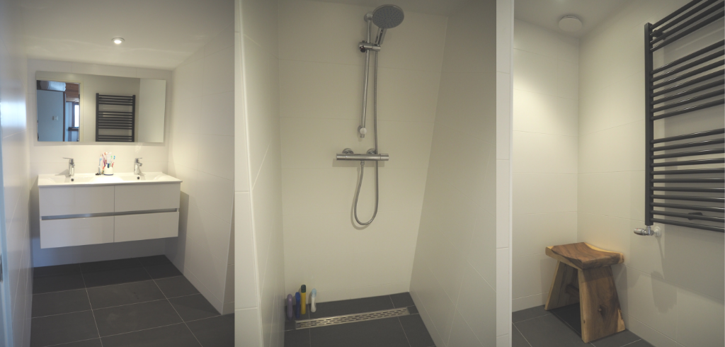 Jaja mensen, die badkamer van ons is af en het is een plaatje! Ben er zo ontzettend blij mee. Van een volgepropte badkamer met ligbad, douchecabine en wasbak zijn we naar een strakke ruime badkamer gegaan. Het ligbad heeft plaatsgemaakt voor een dubbele wasbak en inloopdouche. Dit past veel beter bij ons gezin op dit moment.