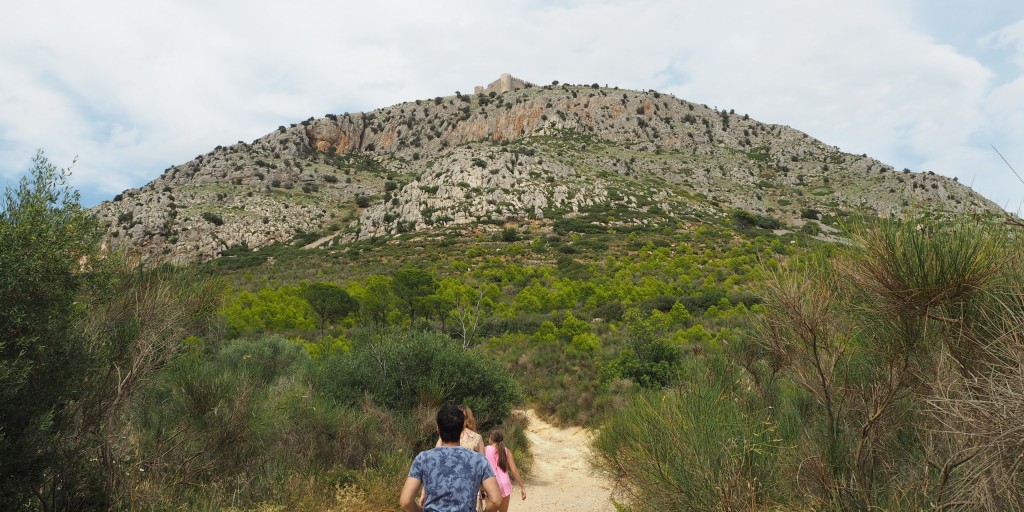 En tja… dat kasteel dat zo prachtig lag te pronken op die heuvel… Waar we elke dag wel langsreden of vanaf het strand van konden genieten. Dat wilde ik ook weleens van dichtbij bewonderen. Dus stevige schoenen aan, bekkenband om, wandelstok èn rolstoel met Freewheel mee en gaan met die banaan. Het was maar een wandelingetje van twee kilometer vanaf de parkeerplaats, met een beetje afwisselen van rolstoel naar lopen moest dat best lukken.