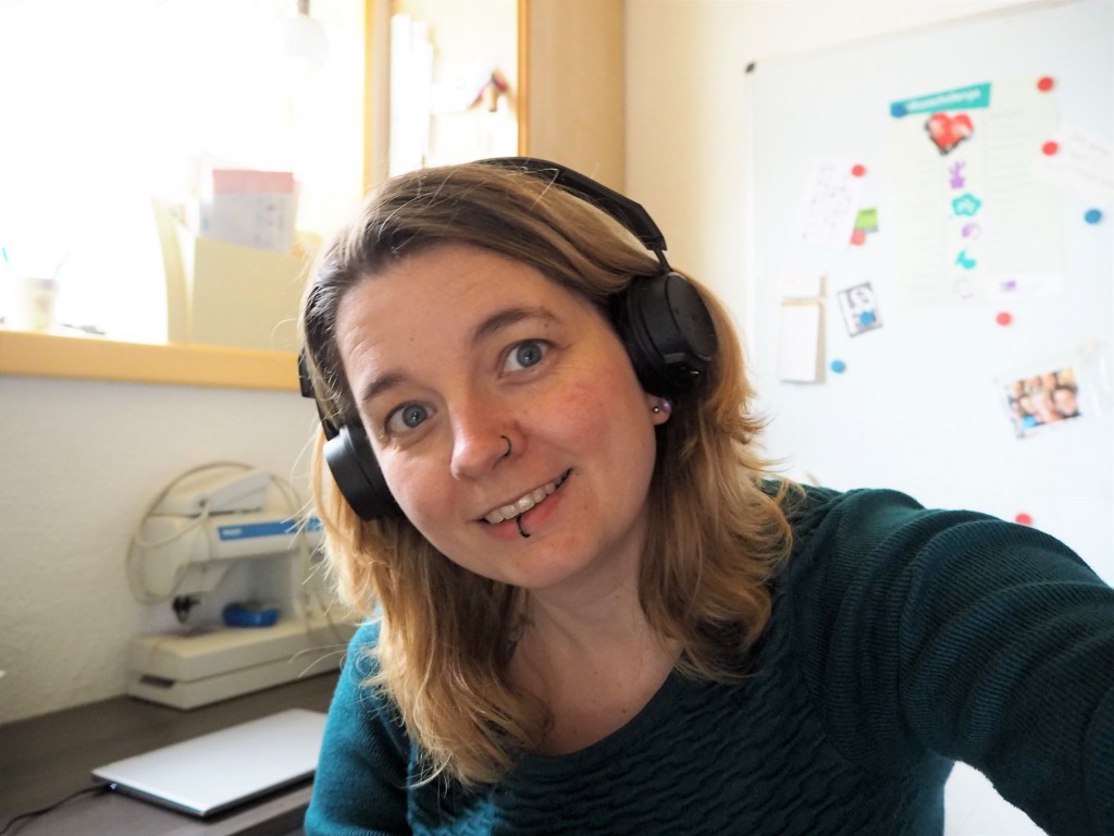 Ik kijk blij, dat is wat me het eerste opvalt. Ben daar ook heerlijk in mijn element: in mijn naaikamertje, muziek luisteren… Wat me verder opvalt is dat de rimpels in mijn voorhoofd zichtbaar zijn en mijn oogleden wat over mijn ogen hangen. Ach ja, ik word ook wat ouder. En ik draag geen make-up, dat doe ik overigens vrijwel nooit. Mijn haar zit wat warrig, waarschijnlijk heb ik het nog niet geborsteld.