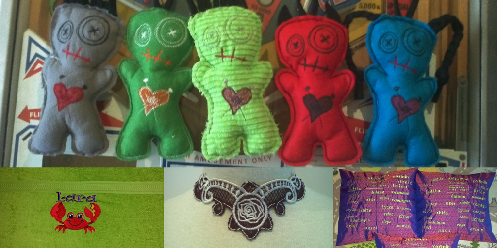 Behalve die namen ergens op borduren, kun je nog veel meer met een borduurmachine. Zo heb je ‘in the hoop’ borduurpatronen, waarbij je bijna geen naaimachine meer nodig hebt. Het borduurpatroon bestaat dan uit verschillende delen, vaak een voor- en achterkant. En vervolgens worden die delen ook met de borduurmachine aan elkaar gemaakt. Hier heb ik bijvoorbeeld de poppetjes mee gemaakt die je boven in de foto ziet.