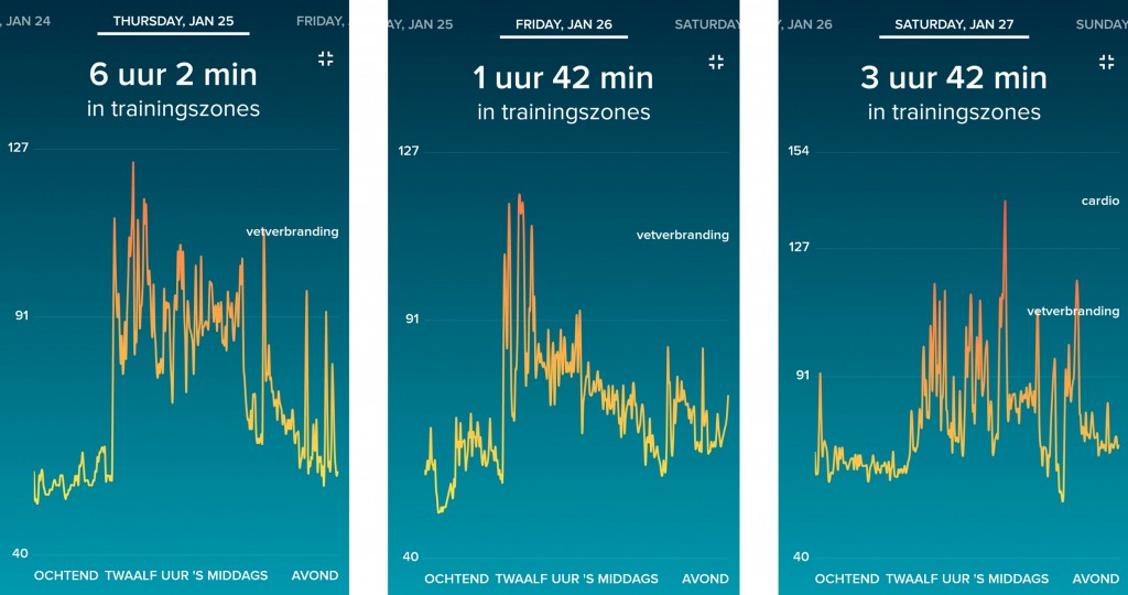 Donderdag had ik een lange en drukke werkdag. ‘s Ochtends schoot mijn hartslag meteen omhoog en kwam pas weer wat lager toen ik thuis op de bank plofte. Die dag was ik kapot en kwam ik alleen nog van de bank af om te eten en naar bed te gaan, dat zijn de pieken die je in de avond ziet.
