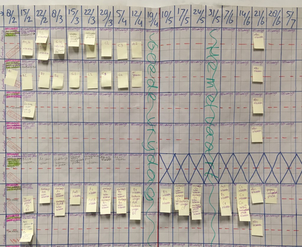 Op een grote flap heb ik de weken die ze nog hebben ingevuld en voor elke student daarin een dubbele rij: boven voor de planning, onder de evaluatie. In de eerste les had ik een voorbeeld laten zien waarbij ik op kleine post-its doelen had beschreven, gekoppeld aan een examenopdracht. Zoals het laten ondertekenen van het startbewijs (op basis van een oefenopdracht), feedback vragen op een opdracht en het inleveren van een examenopdracht. Die post-its had ik verspreid opgeplakt op de planning en studenten mochten dit vervolgens voor zichzelf gaan doen.