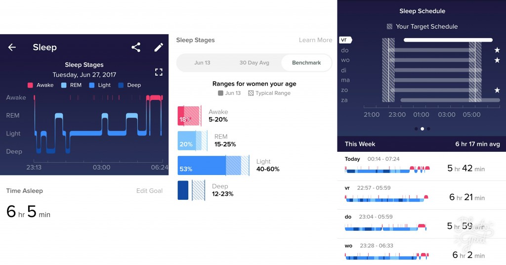 Per week krijg je een gemiddelde te zien van de uren die je per nacht slaapt. Ik kom dan zo rond de zes uur en een kwartier aan slaap. En dan is daar ook het weekend in meegerekend, waarbij ik eerder aan zeven uur slaap kom.