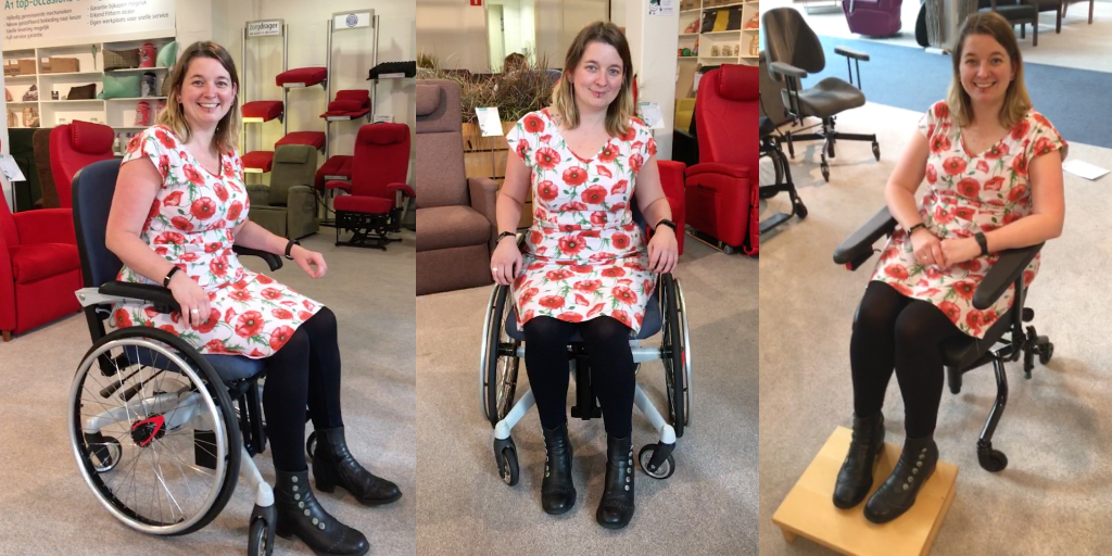 Met mijn ergotherapeut ben ik een trippelrolstoel gaan uitproberen van Sowecare, Le Tripple. Het idee was daarbij dat als ik een trippelstoel heb met hoepels, ik niet meer hoef over te stappen van de ene naar de andere stoel. Zo bespaar ik tijdens mijn werk energie en hoef ook niet meer mijn rolstoel mee te sjouwen.