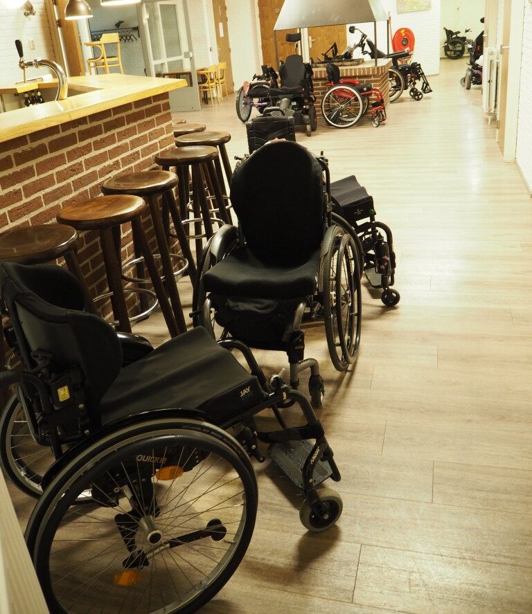 Ik was erg benieuwd naar de locatie. Hoe kun je een grote groep met zo allemaal hun uitdagingen op het gebied van mobiliteit en/of voeding allemaal een fijn plekje geven? Maar deze locatie overtrof toch wel mijn verwachtingen. Twee- tot vierpersoonskamers met gewone bedden en stapelbedden, maar ook hoog-/laagbedden. Elke kamer had een douche en toilet die wel wat aan de krappe kant waren. Maar er was ook een ruimere badkamer met douchestoel beschikbaar. En in de hal kon je prima je rolstoel parkeren, zoals je ziet.